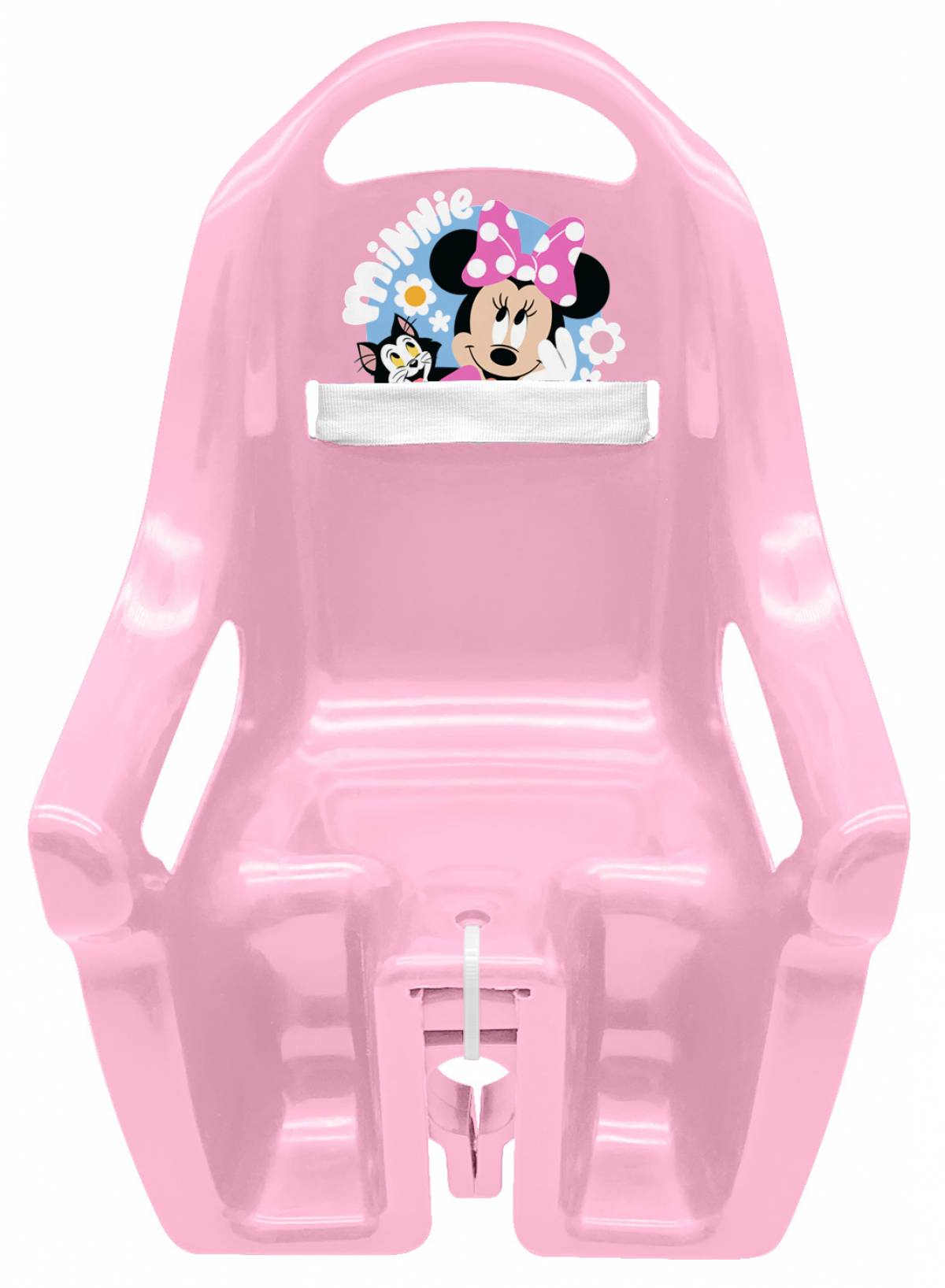 Descriere Suport pentru papusi Minnie Mouse pentru bicicleta copiilor. Caracteristici: prindere universala pe tija seii banda velcro pentru fixare design realist port bebe